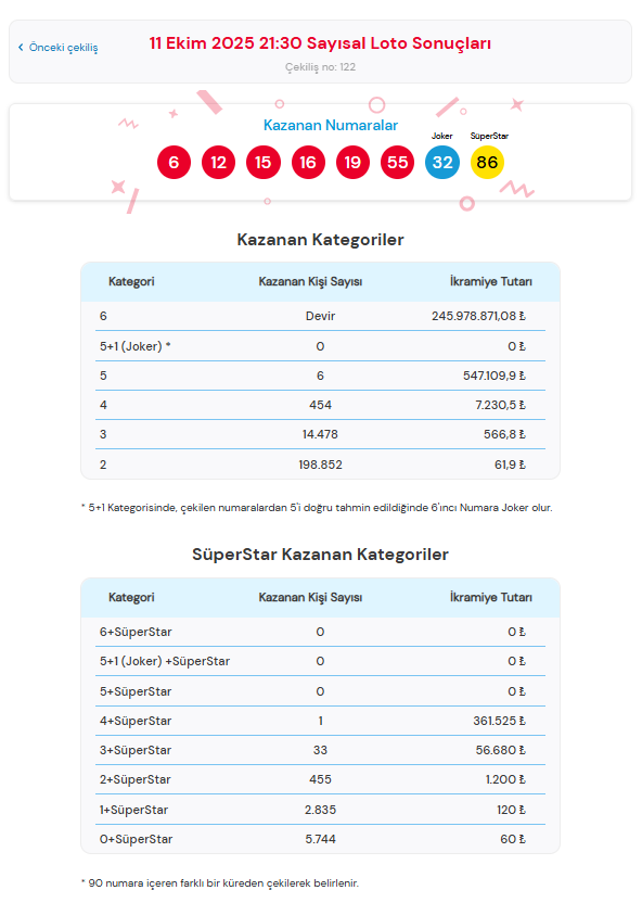 6 bilen oyuncular birinci kategoride yer alır ve en yüksek ikramiyeyi kazanır. 5+1 bilenler ikinci, 5 bilenler üçüncü kategoridedir. Sonraki kategorilerde 4, 3 ve 2 bilenler yer alır. Süper Star ile birlikte doğru sayıları tahmin edenler de ek ikramiyeler kazanabilir.