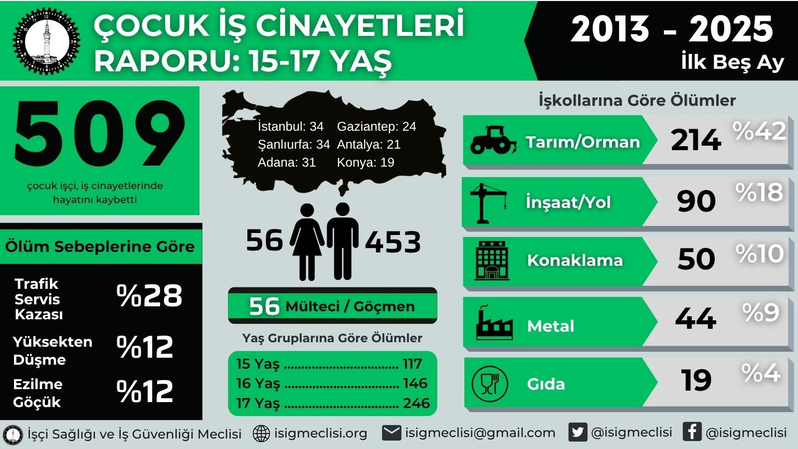Yüzde 90’ı ulusal basından, yüzde 10’u ise çocuk işçilerin aileleri, mesai arkadaşları ve yerel basından edinilen bilgilerle hazırlanan rapora göre, sadece 2025 yılının ilk beş ayında en az 28 çocuk işçi yaşamını yitirdi. 2013 yılından bu yana en yüksek çocuk işçi ölümü ise 71 ölüm ile 2024’te kaydedildi.