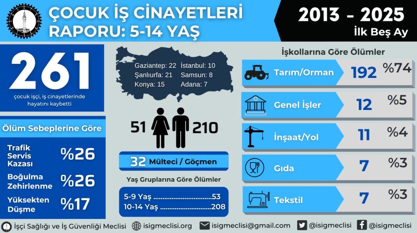 Yüzde 90’ı ulusal basından, yüzde 10’u ise çocuk işçilerin aileleri, mesai arkadaşları ve yerel basından edinilen bilgilerle hazırlanan rapora göre, sadece 2025 yılının ilk beş ayında en az 28 çocuk işçi yaşamını yitirdi. 2013 yılından bu yana en yüksek çocuk işçi ölümü ise 71 ölüm ile 2024’te kaydedildi.