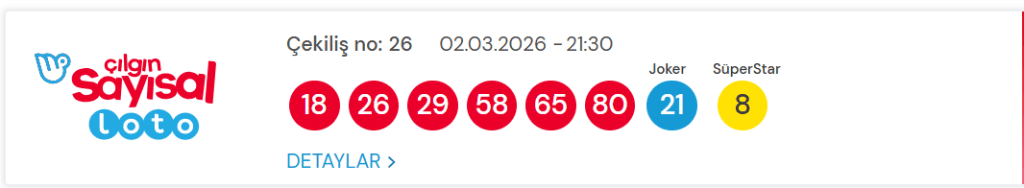 2 Mart Çılgın Sayısal Loto sonuçları noter huzurunda açıklandı. 2 Mart 2026 Çılgın Sayısal Loto çekilişi sonrası sonuçlar ve Çılgın Sayısal sorgulama ekranı erişime açıldı.