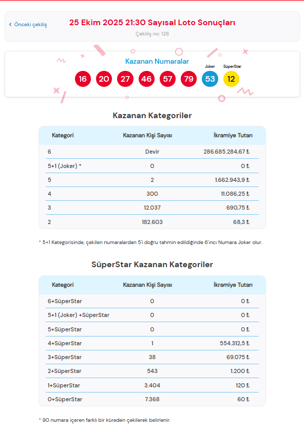 25 EKİM 2025 ÇILGIN SAYISAL SONUÇLARI SORGULAMA
