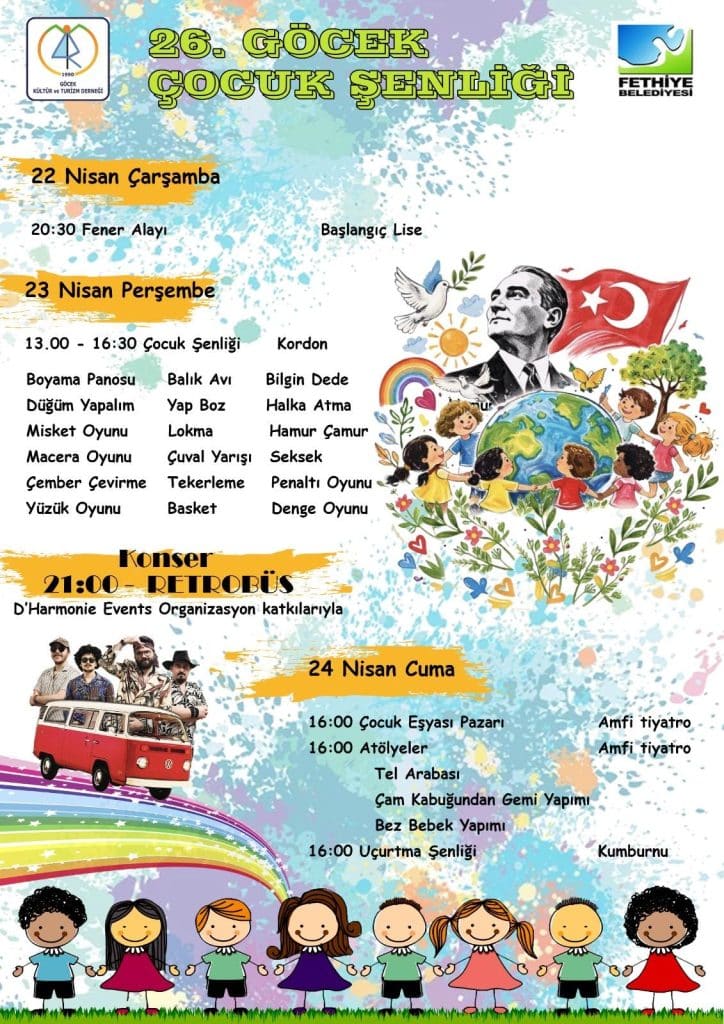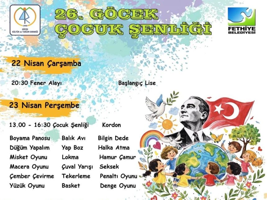 Göcek Kültür ve Turizm Derneği ve Fethiye Belediyesi, 26. Göcek Çocuk Şenliği programını açıkladı. Buna göre, Muğla’nın Fethiye ilçesine bağlı Göcek Mahallesi’nde 22 Nisan Çarşamba günü saat 20:30’da, fener alayı gerçekleşecek.