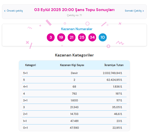 Etiketler: 3 eylül şans topu sonuçları, şans topu sorgulama, şans topu sonuçları, 3 eylül 2025 şans topu, şans topu sonuçları belli oldu mu