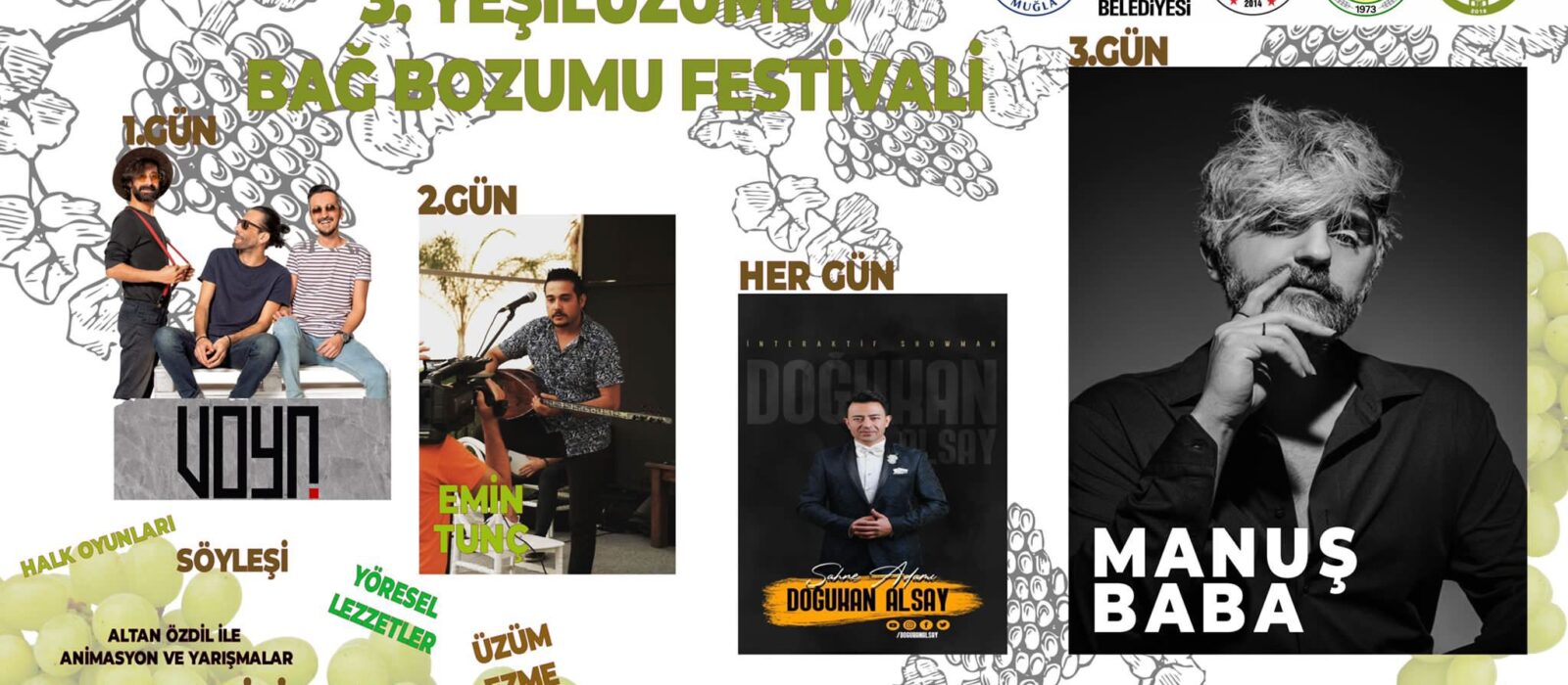 Muğla’nın Fethiye ilçesine bağlı Yeşilüzümlü Mahallesi’nde düzenlenen Yeşilüzümlü Bağ Bozumu Festivali’nin üçüncüsü 14-15-16 Ekim’de gerçekleştirilecek. Muğla’nın Fethiye ilçesine bağlı Yeşilüzümlü Mahallesi’nde düzenlenen Yeşilüzümlü Bağ Bozumu Festivali’nin bu yılki programı açıklandı. Bu yıl üçüncüsü düzenlenen festival, 14-15-16 Ekim tarihlerinde gerçekleştirilecek. Festivalde; Manuş Baba, Emin Tunç ve Voyn sahne alacakken, Doğukan Alsay da Fethiyeliler ile buluşacak.