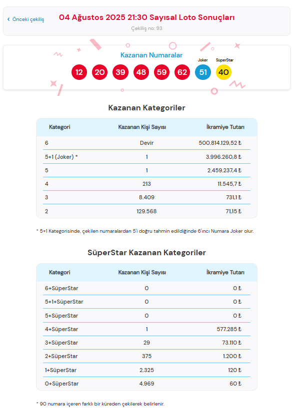 4 Ağustos 2025 Çılgın Sayısal Loto sonuçları açıklandı. Kazanan numaralar, Joker ve SüperStar bilgileri resmi kaynaklarda yer aldı.