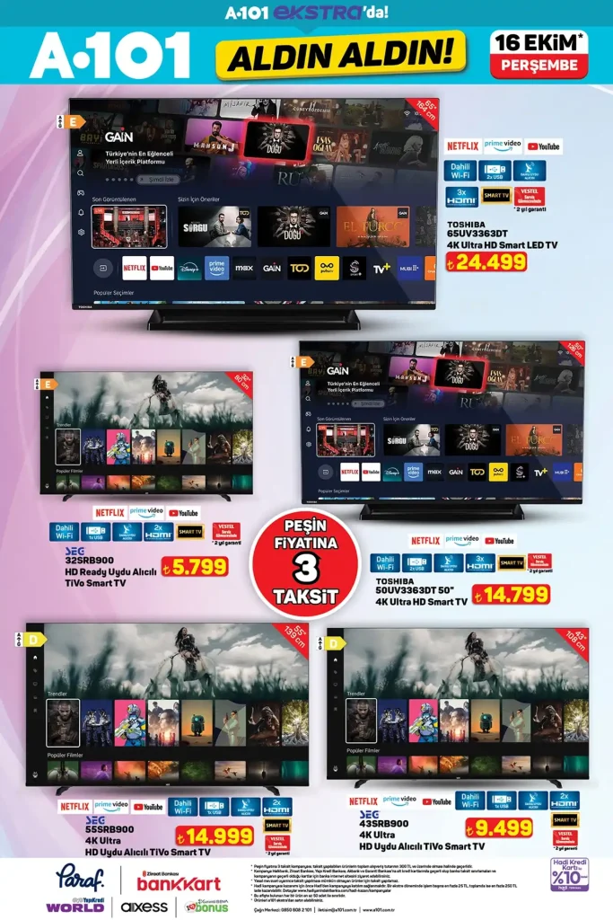 Televizyon grubunda Toshiba 65 inç 4K Ultra HD Smart TV 24.499 TL, Philips 55 inç 4K UHD Smart TV 21.999 TL, Onvo 40 inç FHD Smart TV 7.499 TL, Fobem 50 inç UHD TV 11.999 TL, Hi-Level 32 inç Smart TV ise 5.499 TL fiyatla katalogda yer aldı. Tüm televizyon modelleri peşin fiyatına 3 taksit seçeneğiyle sunuluyor.