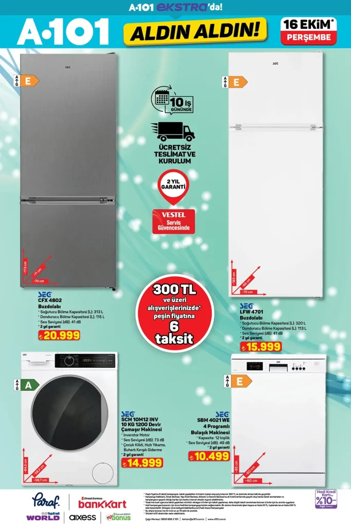 Beyaz eşya grubunda SEG buzdolabı modelleri 15.999 TL ve 20.999 TL, SEG çamaşır makinesi 14.999 TL ve SEG bulaşık makinesi 10.499 TL fiyatla satışa sunuluyor. Regal dik süpürge 1.499 TL, SEG termosifon 6.999 TL, Kiwi su sebili 7.599 TL’den satışta. Ücretsiz teslimat ve kurulum seçeneğiyle sunulan ürünler 2 yıl garantili.