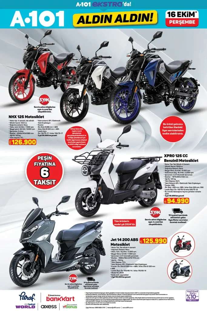 A101 16 Ekim 2025 aktüel kataloğunda motosiklet, telefon, televizyon, elektrikli el aletleri ve beyaz eşya kampanyaları öne çıkıyor.