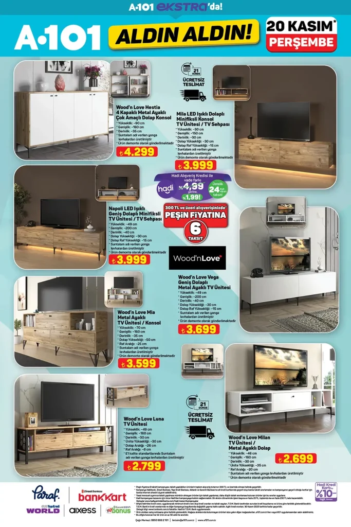 A101 20 Kasım 2025 aktüel kataloğunda tiny house, termos, televizyon, buzdolabı ve motosiklet gibi yüksek fiyatlı ürünler dikkat çekiyor.
