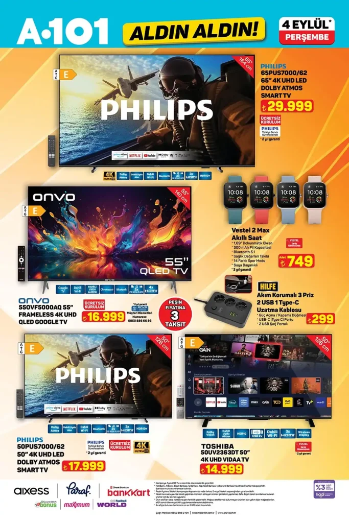 Televizyon bölümünde Philips 65 inç UHD LED TV 29 bin 999 TL, Onvo 55 inç QLED TV 16 bin 999 TL, Toshiba 50 inç UHD TV ise 14 bin 999 TL’den satışa sunuluyor.