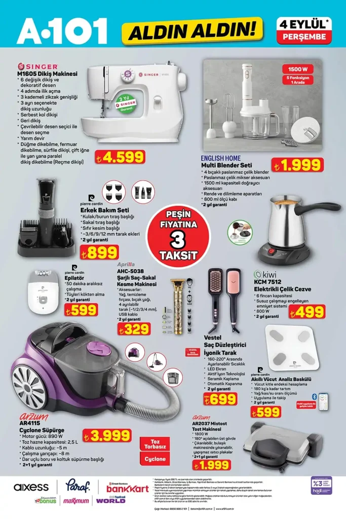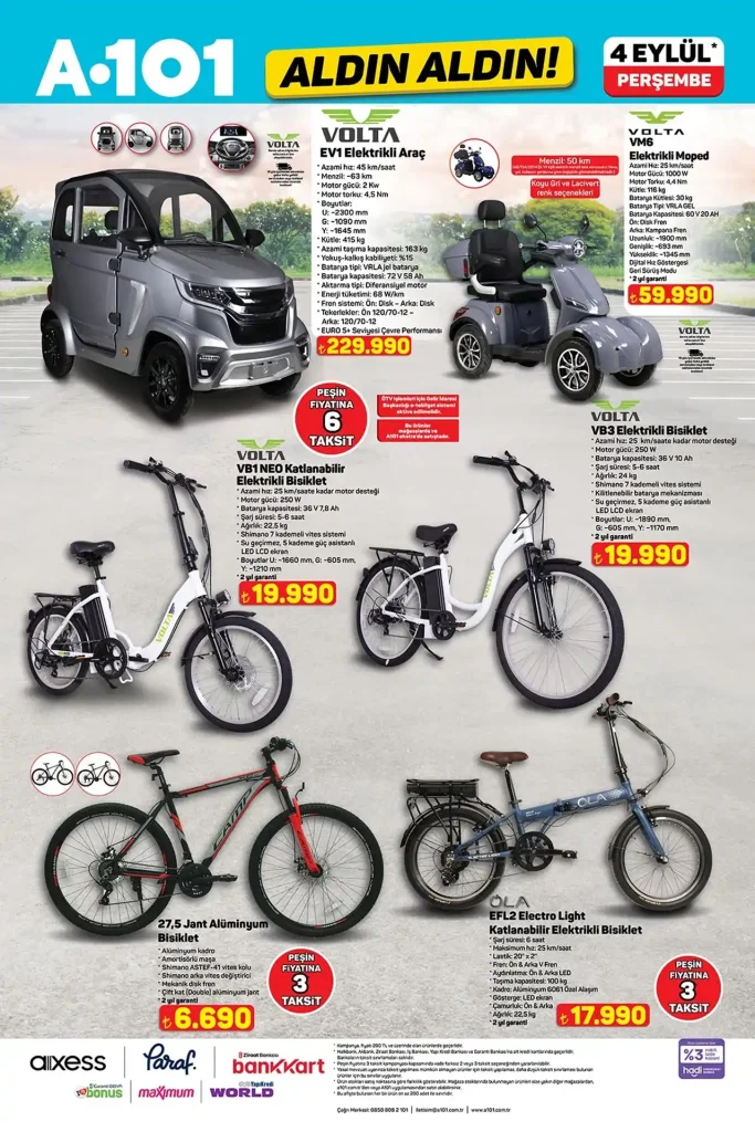 A101 4 Eylül 2025 aktüel kataloğu açıklandı. Elektrikli araç, televizyon, beyaz eşya, mutfak ürünleri ve ev tekstili avantajlı fiyatlarla satışta.