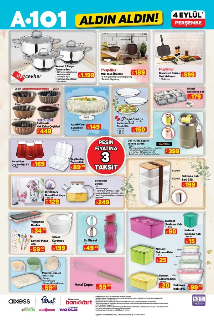 A101 4 Eylül 2025 aktüel kataloğu yayımlandı. Bu haftanın fırsat ürünleri arasında elektrikli araç, beyaz eşya, televizyon, mutfak gereçleri ve ev tekstili öne çıkıyor.