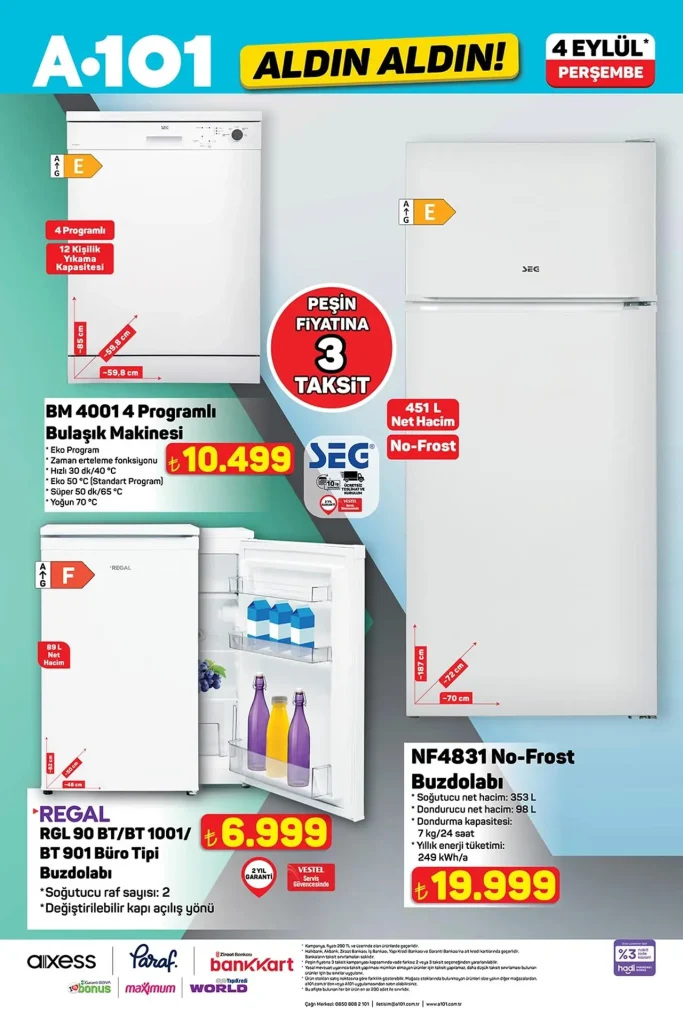 Beyaz eşya grubunda SEG NF4831 no-frost buzdolabı 19 bin 999 TL, SEG BM4001 bulaşık makinesi 10 bin 499 TL, Regal büro tipi buzdolabı 6 bin 999 TL fiyatla katalogda yer alıyor.