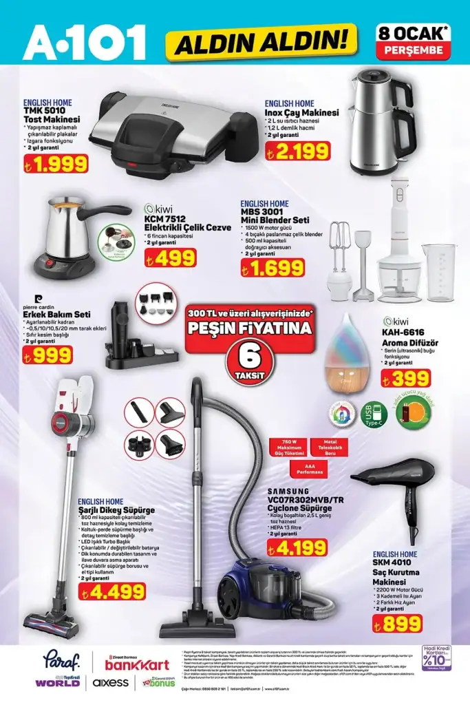 A101, 8 Ocak 2026 Perşembe günü geçerli olacak aktüel ürünler kataloğunu yayınladı. Katalogda teknoloji ürünlerinden ev aletlerine, lisanslı ürünlerden elektrikli araçlara kadar birçok ürün yer alıyor.