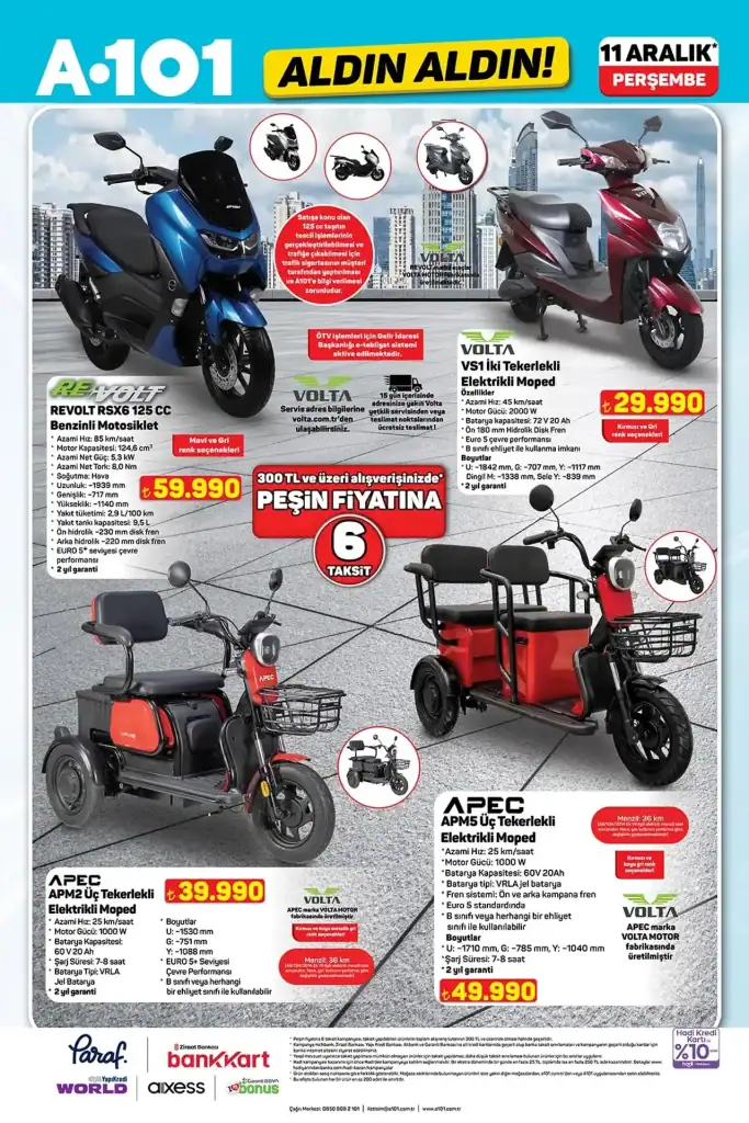 Katalogda yer alan motosiklet grubu ürünleri arasında, Revolt RSX6 125 CC benzinli motosiklet 59.990 TL fiyat etiketiyle dikkat çekiyor. Ayrıca Volta VS1 elektrikli moped 29.990 TL, APEC APM2 üç tekerlekli elektrikli moped 39.990 TL, APEC APM5 üç tekerlekli elektrikli moped ise 49.990 TL fiyatla satışa sunulacak.