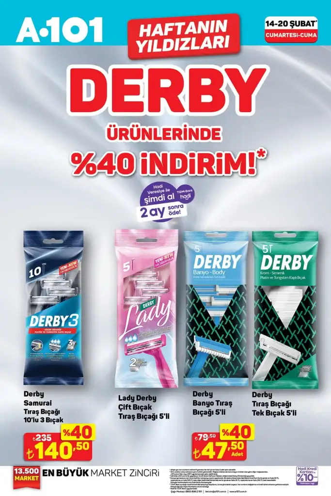 Kampanya kapsamında Derby ürünlerinde yüzde 40 indirim uygulandı. Derby Samurai Tıraş Bıçağı 10’lu 3 bıçaklı ürün 235 TL yerine 140,50 TL’den satışa sunuldu. Lady Derby Çift Bıçak Tıraş Bıçağı 5’li, Derby Banyo Tıraş Bıçağı 5’li ve Derby Tıraş Bıçağı Tek Bıçak 5’li ürünleri kampanya kapsamında yer aldı.