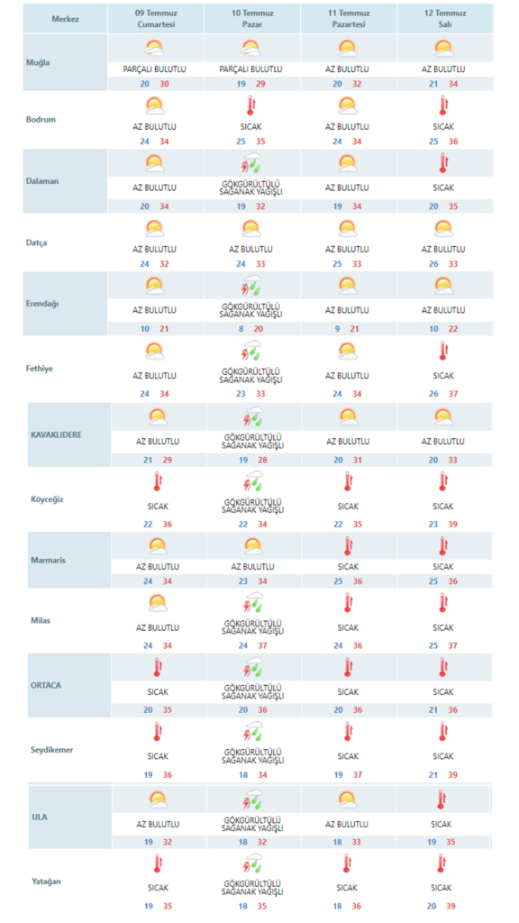 Meteoroloji Genel Müdürlüğü’nün hava tahminlerine göre, 9-10-11-12 Temmuz tarihlerine denk gelen Kurban Bayramı’nın ikinci günü (10 Temmuz) Muğla’nın Fethiye, Dalaman, Kavaklıdere, Köyceğiz, Milas, Ortaca, Seydikemer, Ula ve Yatağan ilçelerinde gök gürültülü sağanak yağış bekleniyor.