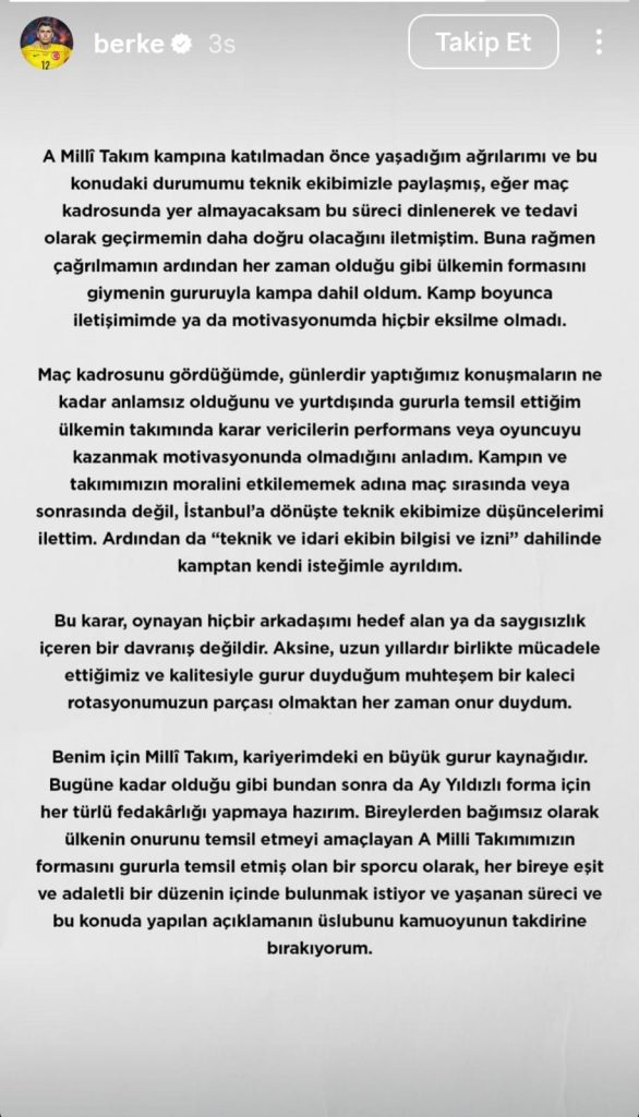 Berke Özer yaptığı açıklamada, kamp öncesinde yaşadığı ağrılardan teknik ekibi haberdar ettiğini ve maç kadrosunda yer almaması halinde tedaviye ağırlık vermek istediğini ilettiğini belirtti. Kadroya alınmaması sonrası kamptan, teknik ve idari ekibin bilgisi dahilinde ayrıldığını ifade eden Özer, “Milli Takım kariyerimdeki en büyük gurur kaynağıdır. Yaşanan süreci kamuoyunun takdirine bırakıyorum” dedi.