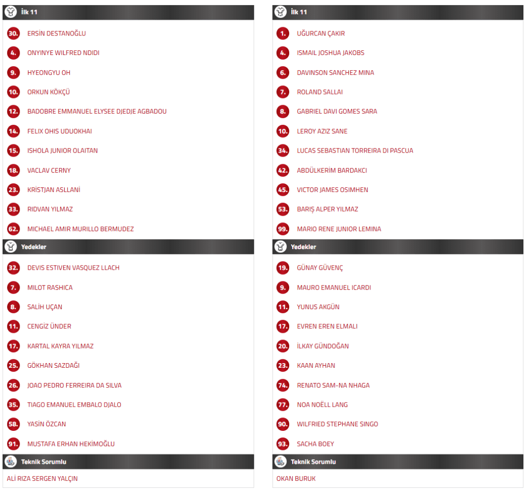 Maçın başlamasına bir saat kala her iki takımın da ilk 11’leri Türkiye Futbol Federasyonu’nun (TFF) resmi internet sitesinde yayınlandı. İşte derbinin ilk 11’leri:
