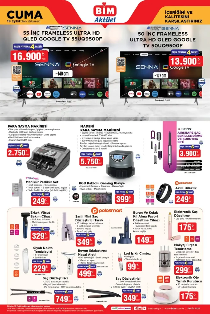 BİM 19 Eylül 2025 Cuma günü itibarıyla satışa sunulacak aktüel ürünleri duyurdu. Katalogda öne çıkan ürünler arasında SENNA markalı QLED Google TV’ler, Arnica elektrikli süpürgeler, ev bakım ve kişisel bakım cihazları, ABS valiz çeşitleri ve çeşitli mutfak ürünleri yer alıyor.