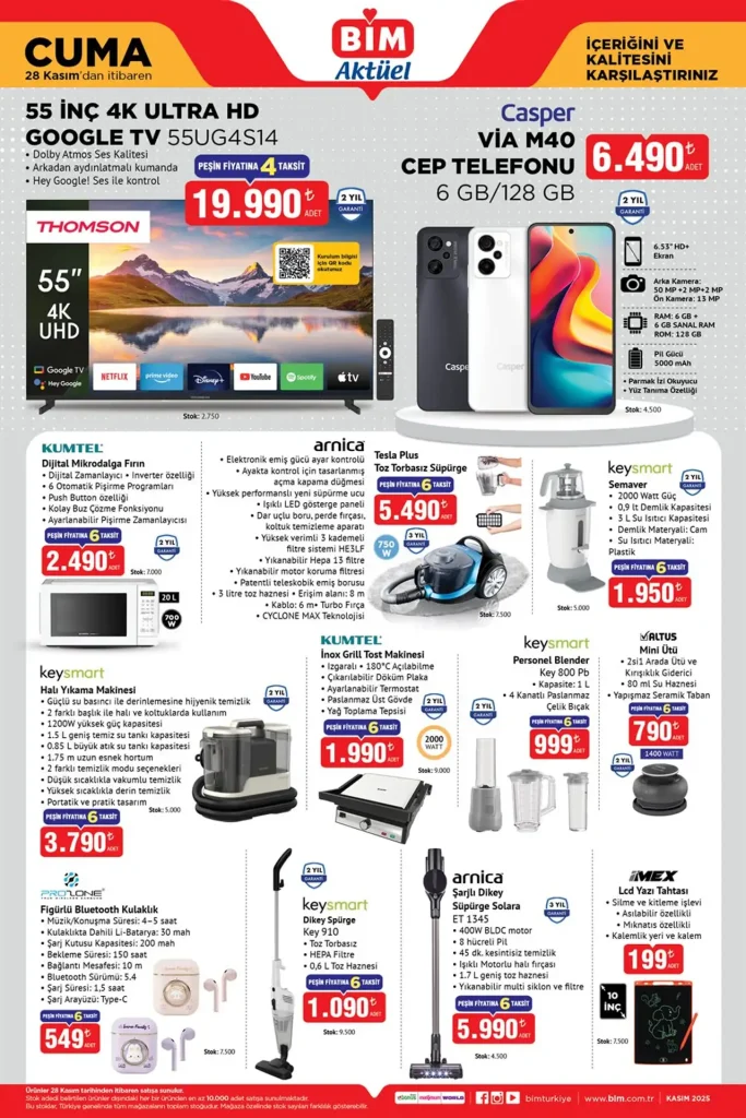 BİM Aktüel kataloğu 28 Kasım 2025 tarihi itibarıyla geçerli olacak indirimli ürünlerde, teknoloji ve ev yaşam kategorilerine yönelik çok sayıda ürün satışa sunuluyor. Elektronik ürünler arasında Thomson marka 55 inç 4K UHD Google TV 19.990 TL fiyatla, Casper VIA M40 cep telefonu ise 6.490 TL fiyatla dikkat çekiyor.