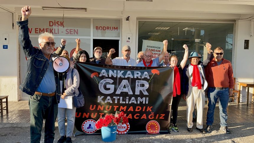 Muğla’nın Bodrum ilçesinde, DİSK Emekli Sen üyeleri tarafından 10 Ekim 2015’te 103 yurttaşın yaşamını yitirdiği Ankara Garı Katliamı’nın 10’uncu yıl dönümü dolayısıyla basın açıklaması yapıldı. Açıklamada, “Bu katliamın üzerindeki sis…