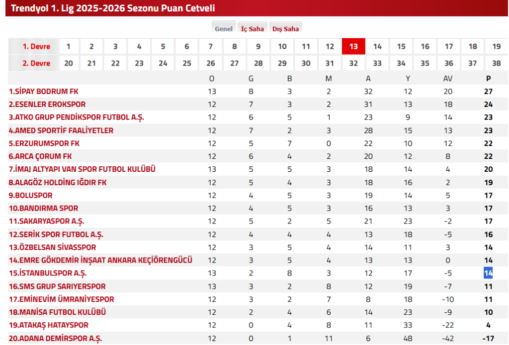 Bu skorla Bodrum FK, 27 puanla ligdeki lider konuma geldi. İstanbulspor ise 14 puanla 15’nci sırada yer aldı.