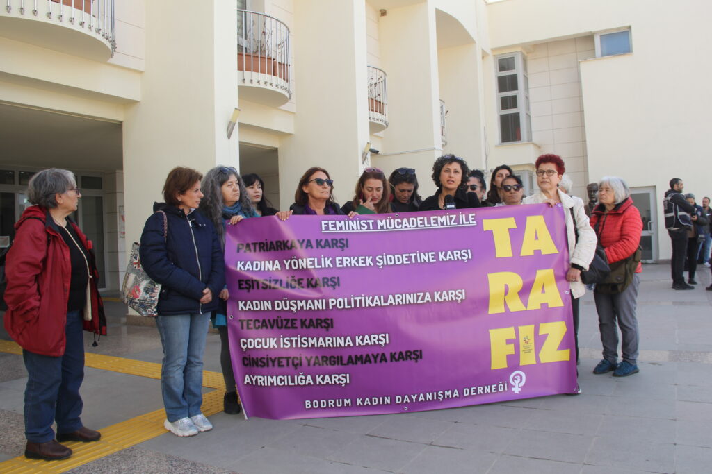 “Şiddete maruz bırakılan kadınların adalete olan güvenleri -bugünkü kararda da gördüğümüz üzere aslında onaylandığı üzere- sarsıldığı için, yüksek derecede sarsıldığı için erkek şiddetine karşı mücadele veren kadın örgütlerine başvurmaları tabii ki süreci aslında kolaylaştırıyor. Mesela bu örnekte olduğu gibi belki örnek üzerinden anlatması daha kolay anlaşılır olur. Bodrum Devlet Hastanesi’nde 2022 yılına kadar cinsel saldırı muayene raporu bile düzenlenmiyordu. Başhekim bile bu böyle bir raporun olduğundan habersizdi. Bizim bu mücadelemiz sonucunda 2022 yılından itibaren bu raporlar artık tanzim edilmeye başlandı. Eksik de olsa tanzim edilmeye başlandı. Dolayısıyla biz başvurucuyu 2021 Eylül ayında olduğu için Muğla Sıtkı Koçman Üniversitesi’ndeki Adli Tıp Kurumu’na ve acil giriş yaptırarak aslında bu raporu alınmasını sağladık. Biz de bu bilgi ve bu deneyimler olmasaydı kadın belki başka yerlere başvuru yapacak veya hiç başvuru yapamayacak derecede yalnızlaştırılmış olacaktı. Biz hem hukuki süreci başlatmasını sağladık dernek olarak. Aynı zamanda gerek kendi derneğimizin psikoloğu vasıtasıyla gerekse Mor Çatı Kadın Sığınağı Vakfı’nın destekleriyle kadının psikolojik olarak güçlendirilmesi yönünde de destek almasını sağladık. Ve evet bu duruşmalara biz bir sürü kadınla geldik ve davanın takipçisi olduğumuzu ilan ediyoruz. Bu da kadının bu yargılama sürecindeki yaşadığı ve yaşatılan yalnızlaştırma sürecine en azından bir destektir. Yani devletin sağlamadığı destek mekanizmalarını biz kadınlar dayanışarak ve örgütlenerek sağlıyoruz. Bunu da sürdüreceğimizi bir daha bildirebiliriz.”