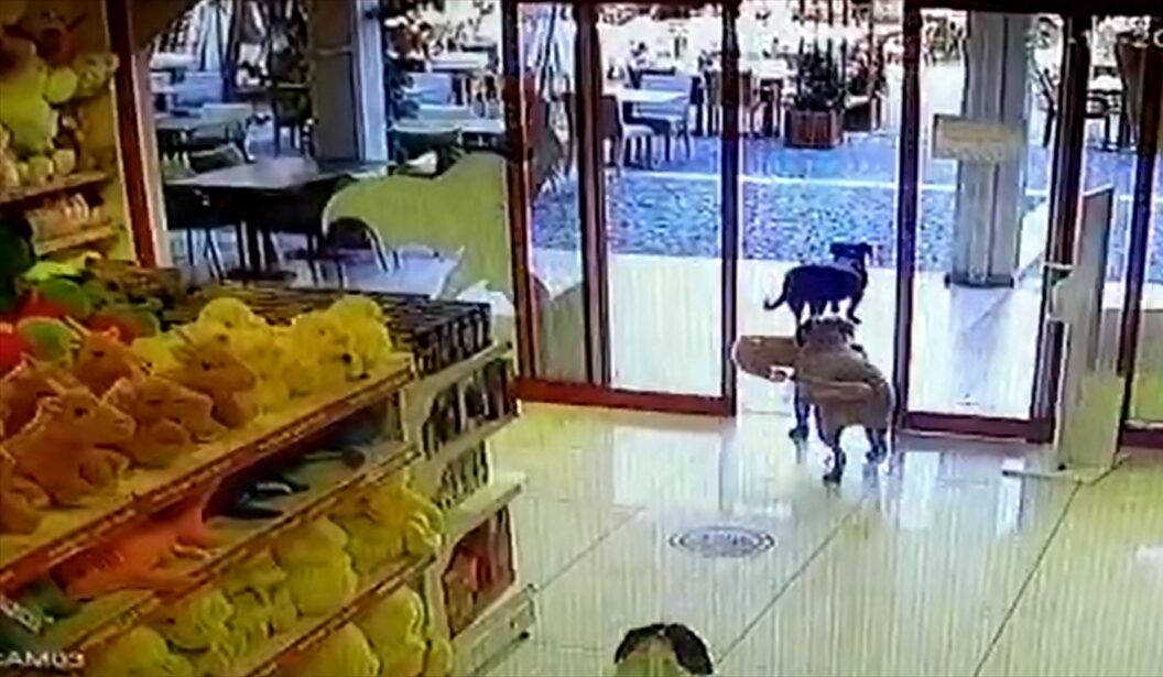 Muğla’nın Bodrum ilçesinde, bir alışveriş merkezindeki oyuncakçıya giren iki köpekten biri, pelüş oyuncak köpeği ağzına alarak mağazadan çıktı. İki köpek mağaza kapısında bekleyen diğer köpeklerle birlikte bölgeden uzaklaştı.