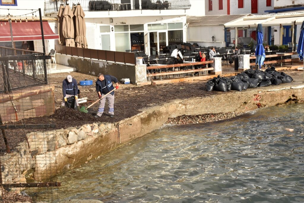 Muğla’nın Bodrum ilçesinde, kuvvetli rüzgarda kıyıya sürüklenen yosunlar ile atıklar temizlendi.