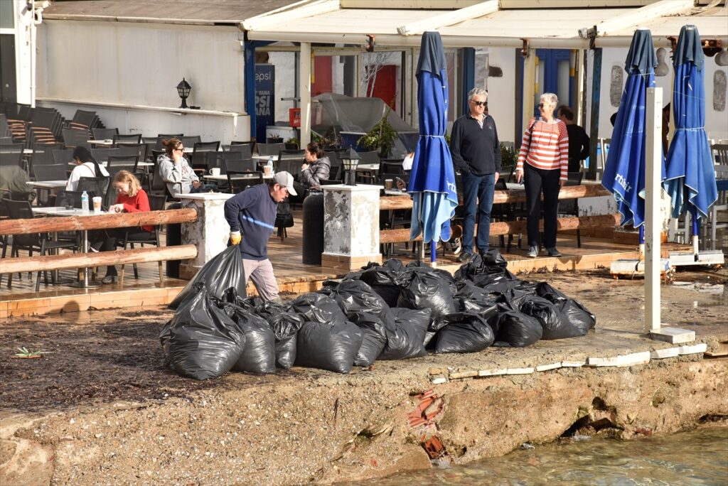 Bodrum’da dün kuvvetli rüzgarla oluşan dalgalar, kıyıya yosun ve bazı atıkları sürükledi. Bodrum Belediyesi ve sahildeki işletmelerde çalışanlar, temizlik çalışması başlattı.