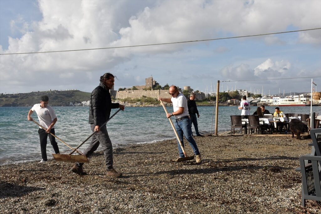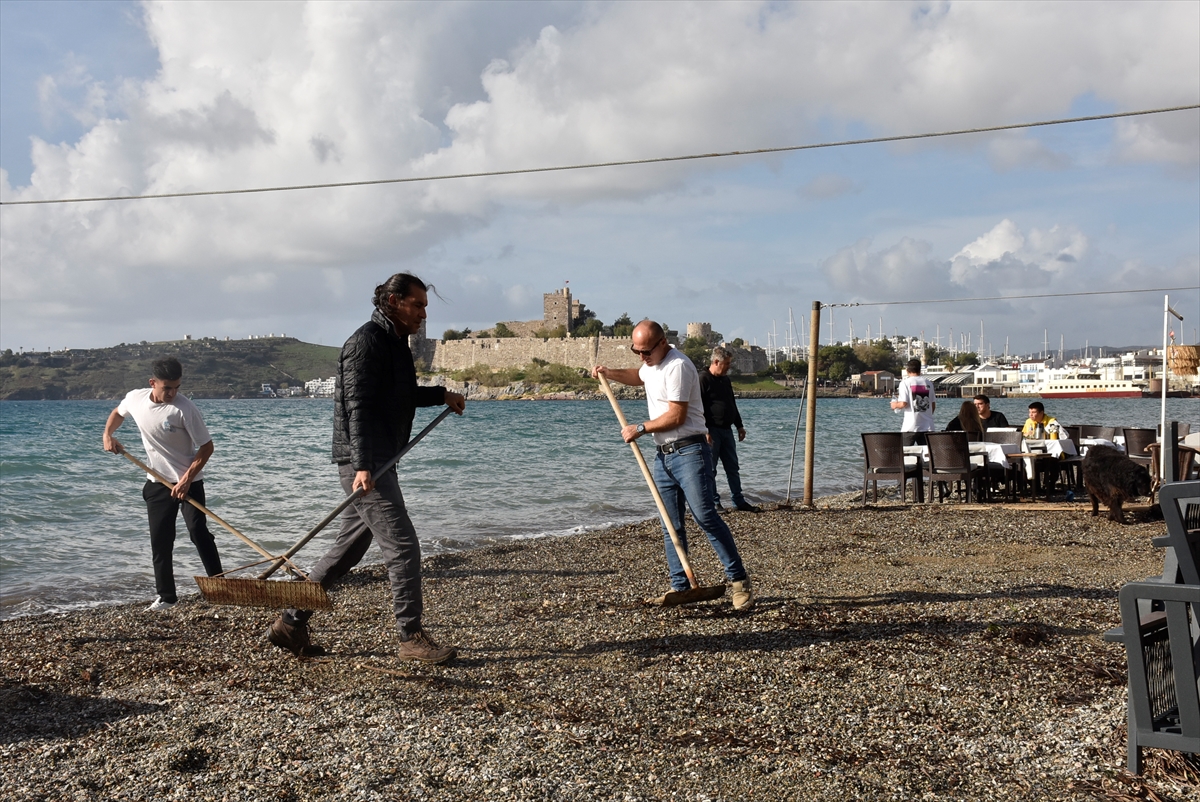 Muğla’nın Bodrum ilçesinde, kuvvetli rüzgarda kıyıya sürüklenen yosunlar ile atıklar temizlendi.