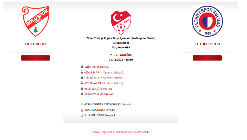 Türkiye Kupası A Grubu mücadelesi, 24 Aralık 2025 Çarşamba günü Bolu Atatürk Stadı’nda oynanacak. Karşılaşma saat 15.30’da başlayacak. Maçta hakem Fatih Tokail görev alacak.