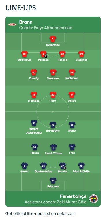Brann, UEFA Avrupa Ligi grup aşamasında çıktığı beş maçta iki galibiyet, iki beraberlik ve bir mağlubiyet elde etti. Aynı puana sahip olan Fenerbahçe ise grupta 20’nci sırada yer alıyor. Sarı-lacivertli ekip deplasmandan galibiyetle dönerek ilk sekiz hedefini sürdürmek istiyor.