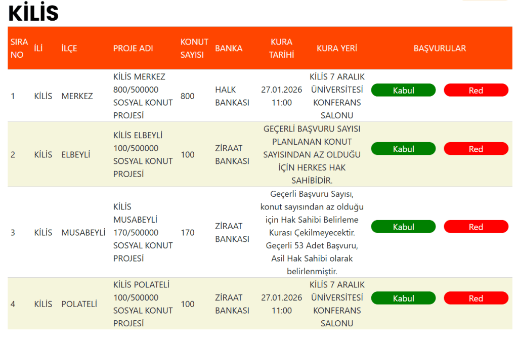 “Yüzyılın Konut Projesi” kapsamında Kilis’te inşa edilecek bin 170 sosyal konut için hak sahipleri noter huzurunda yapılacak kura çekimiyle belirlenecek. Çekilişin ardından asil ve yedek listeler kamuoyuyla paylaşılacak.