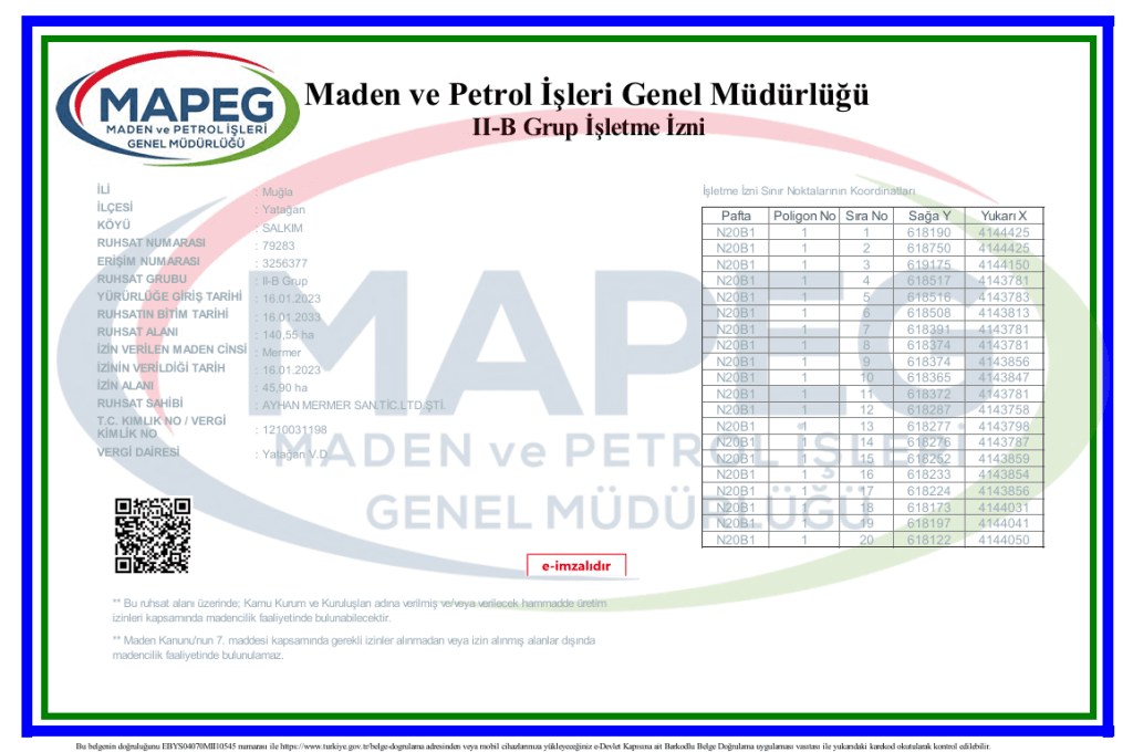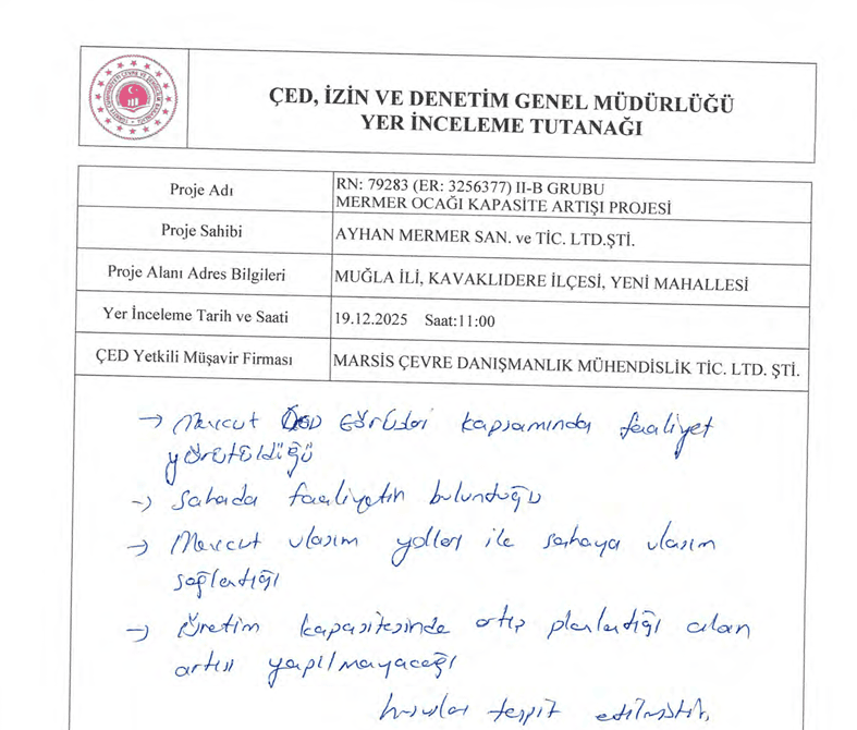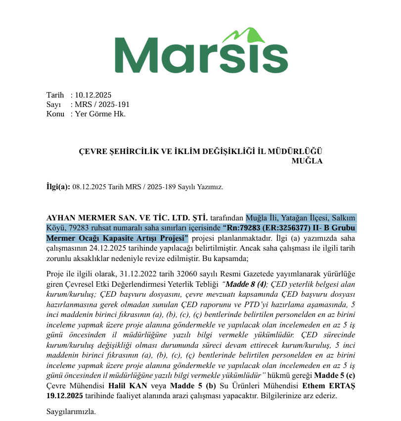 Ocak 2026’da Muğla’daki dikkat çekici projelerden biri, Ayhan Mermer Sanayi ve Ticaret Limited Şirketi tarafından planlanan mermer ocağı kapasite artışı projesiydi. Bu proje, ÇED duyuru portalında 13 Ocak 2026 tarihinde yayımlandı ve resmi kayıtlarda Yatağan ilçesinde gösterildi. Duyuruya göre Muğla Valiliği, Yatağan’da RN:79283 (ER:3256377) numaralı mermer ocağı sahasında kapasite artışı yapmak isteyen firmanın Proje Tanıtım Dosyası’nı (PTD) inceleyerek ÇED sürecini başlatmıştı.