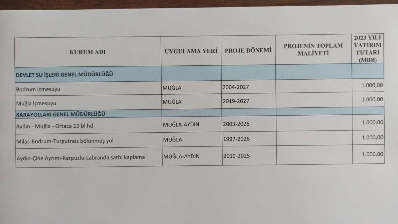“Yatırım Programı”nda Muğla’ya yıllardır beklenen yatırımlar için çok az ya da hiç ödenek ayrılmadığını gördüklerini belirten Süleyman Girgin, “Sandras Suyu ile ilgili ‘yapacağız’ dedikleri ve 2019 yılında başlayan proje için 2023 yılında ödenek ayrılmadı. Bodrum İçme Suyu Projesi için de ödenek ayrılmadı. Milas-Bodrum-Turgutreis bölünmüş yol için de ödenek ayrılmadı. Aydın-Muğla-Ortaca yolunun 13’üncü bölümü için de ödenek ayrılmadı. Aydın-Çine ayrımı, Karpuzlu Labranda sathi kaplama için de ödenek ayrılmadı. Bunlar için sembolik rakamlar konuldu” ifadelerini kullandı.