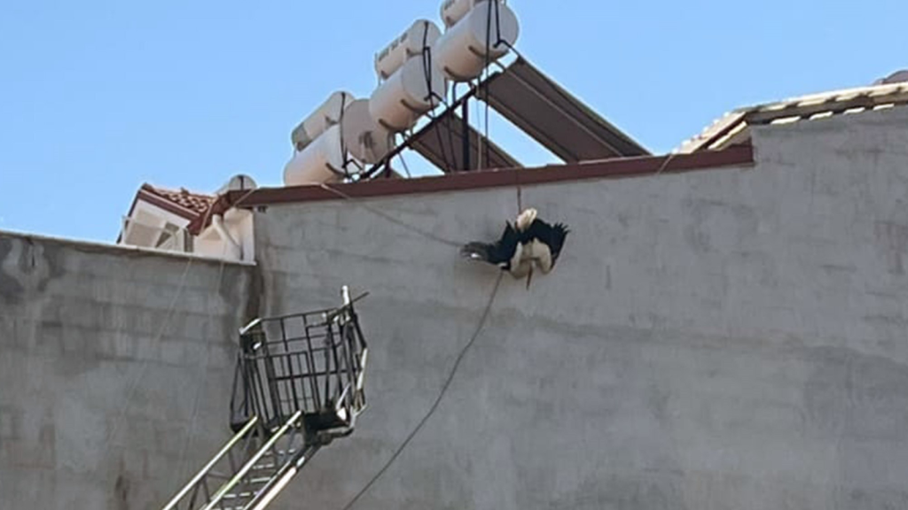 Muğla’nın Dalaman ilçesindeki bir apartmanın çatısında kabloya dolanan leylek, itfaiye ekipleri tarafından kurtarıldı.