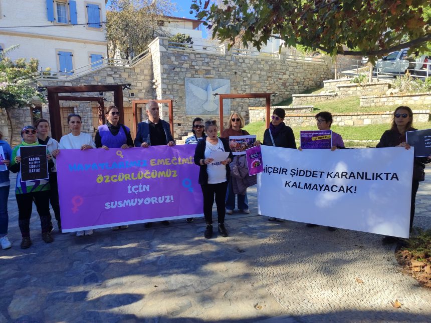 25 Kasım Kadına Yönelik Şiddetle Mücadele Günü kapsamında Muğla’nın Datça ilçesinde kadınlar, bugün (25 Kasım) saat 12.00’de Demokrasi Evi önünde bir araya geldi.