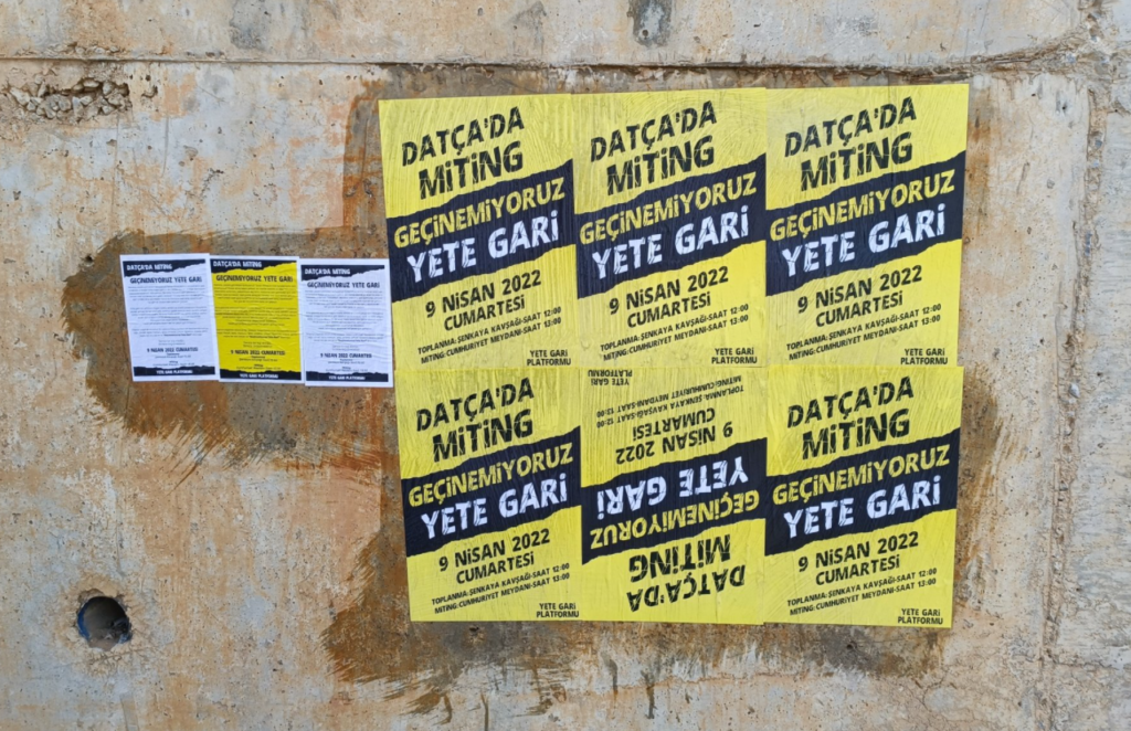 Muğla’nın Datça ilçesinde, Datça’da bulunan siyasi parti, sendika, dernek ve çeşitli platformların hayat pahalılığına karşı bir miting organize etmek üzere bir araya geldiği Yete Gari Platformu, 9 Nisan 2022 tarihinde zamlara karşı miting düzenleyeceğini duyurdu ve mitinge çağrı yaptı.