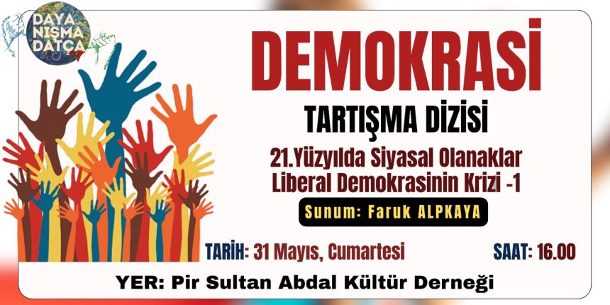 Dayanışma Datça, “Demokrasi” üst başlığıyla Muğla’nın Datça ilçesinde bir tartışma dizisine başlıyor. Planlama konusunda herkesin fikir ve görüşlerine açık olduğu belirtilen dizinin ilki, “21’inci Yüzyılda Siyasi Olanaklar | Liberal Demokrasinin Krizi” başlığıyla 31 Mayıs 2025’te düzenlenecek.