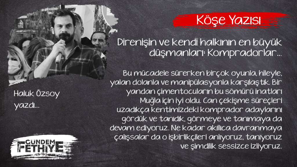 Bu mücadele sürerken birçok oyunla, hileyle, yalan dolanla ve manipülasyonla karşılaştık. Bir yandan çimentocuların bu sömürü inatları Muğla için iyi oldu. Can çekişme süreçleri uzadıkça kentimizdeki komprador adaylarını gördük ve tanıdık, görmeye ve tanımaya da devam ediyoruz. Ne kadar akıllıca davranmaya çalışsalar da o işbirlikçileri anlıyoruz, tanıyoruz ve şimdilik sessizce izliyoruz.