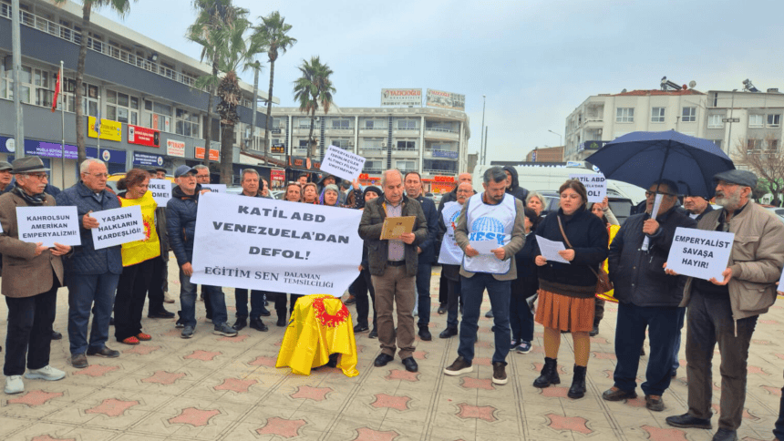 Muğla’nın Dalaman ilçesindeki Cumhuriyet Meydanı’nda, Eğitim ve Bilim Emekçileri Sendikası (Eğitim Sen) Dalaman Şubesi, Venezuela’da yaşanan gelişmeler hakkında basın açıklaması düzenledi.