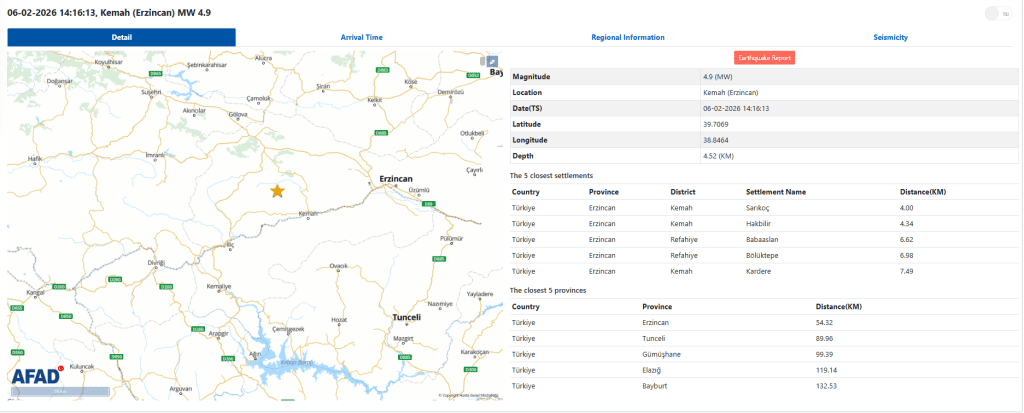 AFAD’ın internet sitesinde yer alan bilgilere göre deprem, saat 14.16’da gerçekleşti. Yer sarsıntısının yerin 4,52 kilometre derinliğinde meydana geldiği açıklandı.