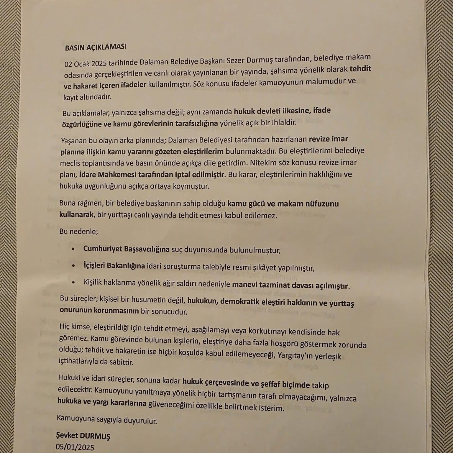 Dalaman Belediye Başkanı Sezer Durmuş, sosyal medyadan yaptığı canlı yayında iptal edilen imar planına ilişkin kendisine yönelik iddialara yanıt vermişti. Eski Dalaman Belediye Başkanı Şevket Durmuş, Sezer Durmuş’un yayında kullandığı ifadeler dolayısıyla suç duyurusunda bulundu: “Hiç kimse eleştirildiği için tehdit etmeyi, aşağılamayı veya korkutmayı kendisinde hak göremez.”