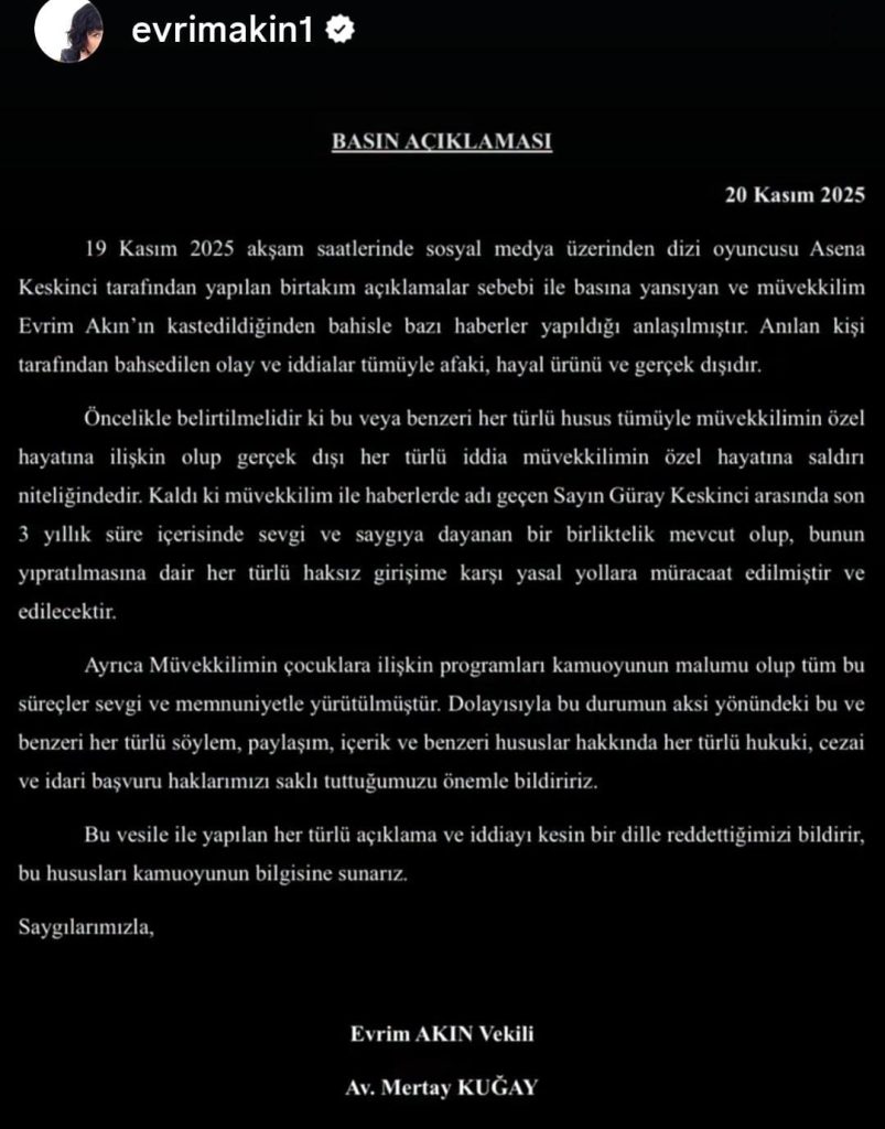Sosyal medyada gündem olan bu açıklamalara karşılık, Evrim Akın’ın avukatı aracılığıyla yaptığı açıklamada iddiaların asılsız olduğu ve hukuki sürecin başlatıldığı belirtildi.