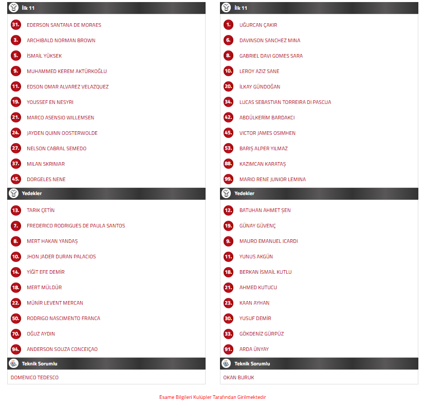 Yunus Akgün, Victor Osimhen ve Mario Lemina ise sakatlıklarını atlatarak kadroya döndü. Teknik ekipten forma şansı almaları halinde sahada olacaklar.