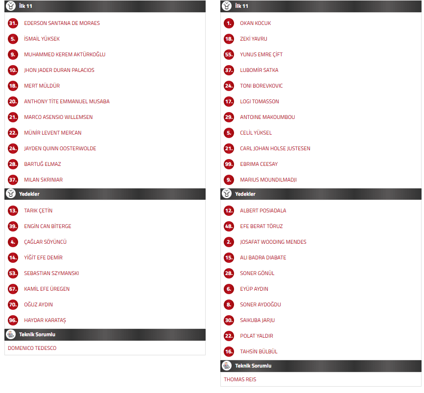 Samsunspor’da ise Emre Kılınç, Celil Yüksel, Ntcham, Afonso Sousa ve Coulibaly sakatlıkları nedeniyle kadroda bulunmuyor. Cherif Ndiaye de milli takımda olduğu için maçta yer almayacak.