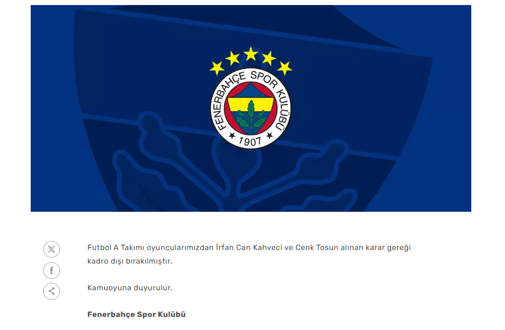 Fenerbahçe, İrfan Can Kahveci ve Cenk Tosun’un kadro dışı bırakıldığını açıkladı. Kararın ardından kulüpten resmi açıklama yapıldı.