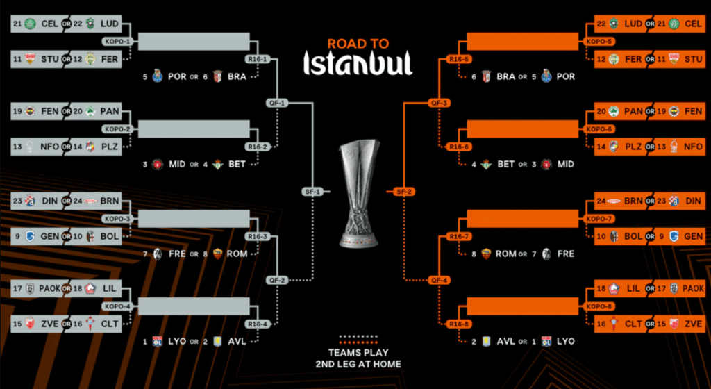 Lig etabını ilk sekiz sırada tamamlayan takımlar, kura çekimine dahil olmadan doğrudan son 16’ncı turuna yükseldi. Bu ekipler: Lyon, Aston Villa, Midtjylland, Real Betis, Porto, Braga, Freiburg ve Roma.